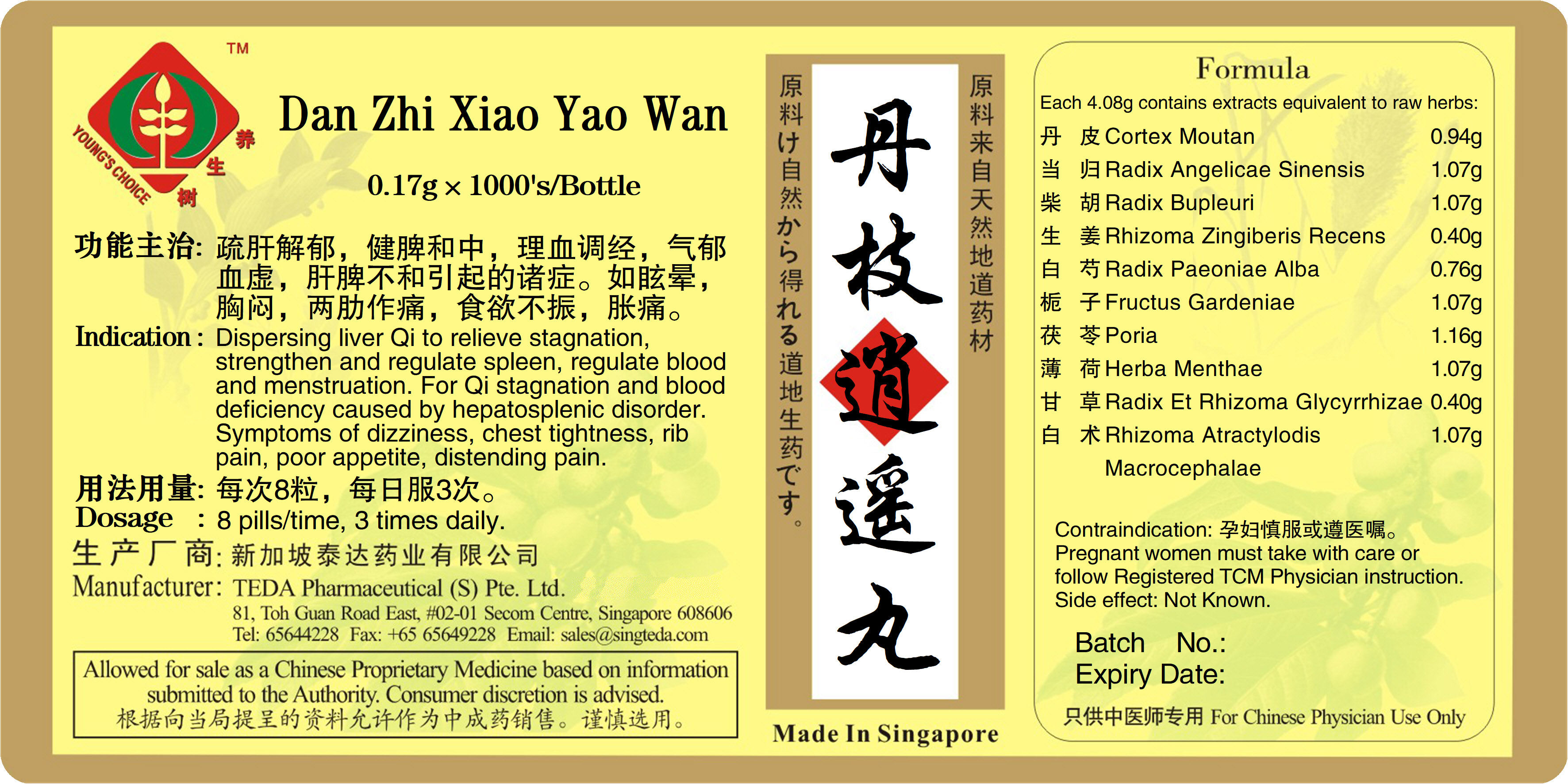 丹枝逍遥丸 Dan Zhi Xiao Yao Wan (1000's) (WDZ02) Category: Pills UOM: BOT 【功能主治】 疏肝解郁,健脾和中,理血调经,气郁血虚,肝脾不和引起的诸症。如眩晕,胸闷,两肋作痛,食欲不振,胀痛。 Indication: For invigorating the functions of liver and spleen for vertigo, fullness in chest, dysphoria, retching anorexia, bloated stomach. Ingredients: 丹皮 Cortex Moutan 当归 Radix Angelicae Sinensis 柴胡 Radix Bupleuri 生姜 Rhizoma Zingiberis Recens 白芍 Radix Paeoniae Alba 栀子 Fructus Gardeniae 茯苓Poria 薄荷 Herba Menthae 甘草 Radix Et Rhizoma Glycyrrhizae 白术 Rhizoma Atractylodis Macrocephalae SGD 23.80 |