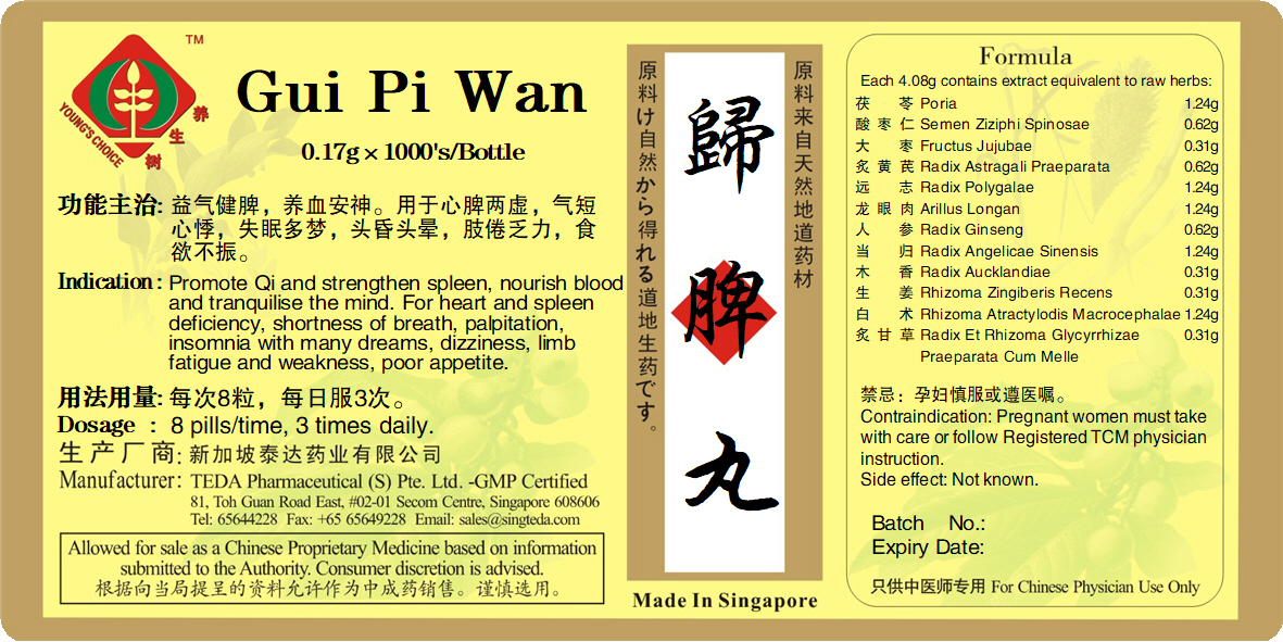 归脾丸 Gui Pi Wan (1000's) (WGP02) Category: Pills UOM: 【功能主治】 益气健脾,养血安神。用于心脾两虚,气短心悸,失眠多梦,头昏头晕,肢倦乏力,食欲不振。 Indication: Promote Qi and strengthen spleen, nourish blood and tranquilise the mind. For heart and spleen deficiency, shortness of breath, palpitation, insomnia with many dreams, dizziness, limb fatigue and weakness, poor appetite. Ingredients: 茯苓 Poria 酸枣仁 Semen Ziziphi Spinosae 大枣 Fructus Jujubae 炙黄芪 Radix Astragali Praeparata 远志 Radix Polygalae 龙眼肉 Arillus Longan 人参 Radix Ginseng 当归 Radix Angelicae Sinensis 木香 Radix Aucklandie 生姜 Rhizoma Zingiberis Recens 白术 Rhizoma Atractylodis Macrocephalae 炙甘草 Radix Et Rhizoma Glycyrrhizae Praeparata Cum Melle SGD 25.00 |