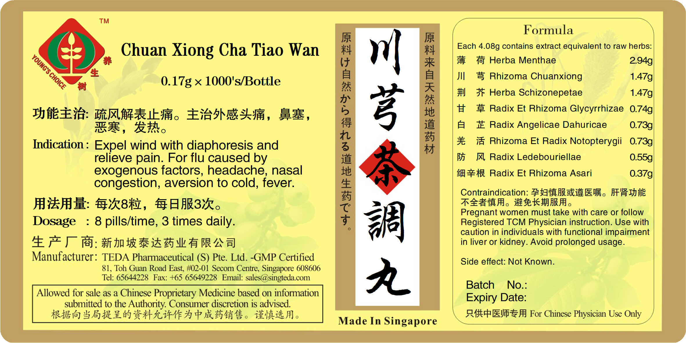 川芎茶调丸 Chuan Xiong Cha Tiao Wan (1000's) (WCX02) Category: Pills UOM: Bottle 【功能主治】 疏风解表止痛。主治外感头痛,鼻塞,恶寒,发热。 Indication: Expel wind with diaphoresis and relieve pain. For flu caused by exogenous factors, headache, nasal congestion, aversion to cold, fever. Ingredients: 薄荷 Herba Menthae 川芎 Rhizoma Chuanxiong 荆芥 Herba Schizonepetae 甘草 Radix Et Rhizoma Glycyrrhizae 白芷 Radix Angelicae Dahuricae 羌活 Rhizoma Et Radix Notopterygii 防风 Radix Ledebouriellae 细辛根 Radix Et Rhizoma Asari SGD 23.80 |