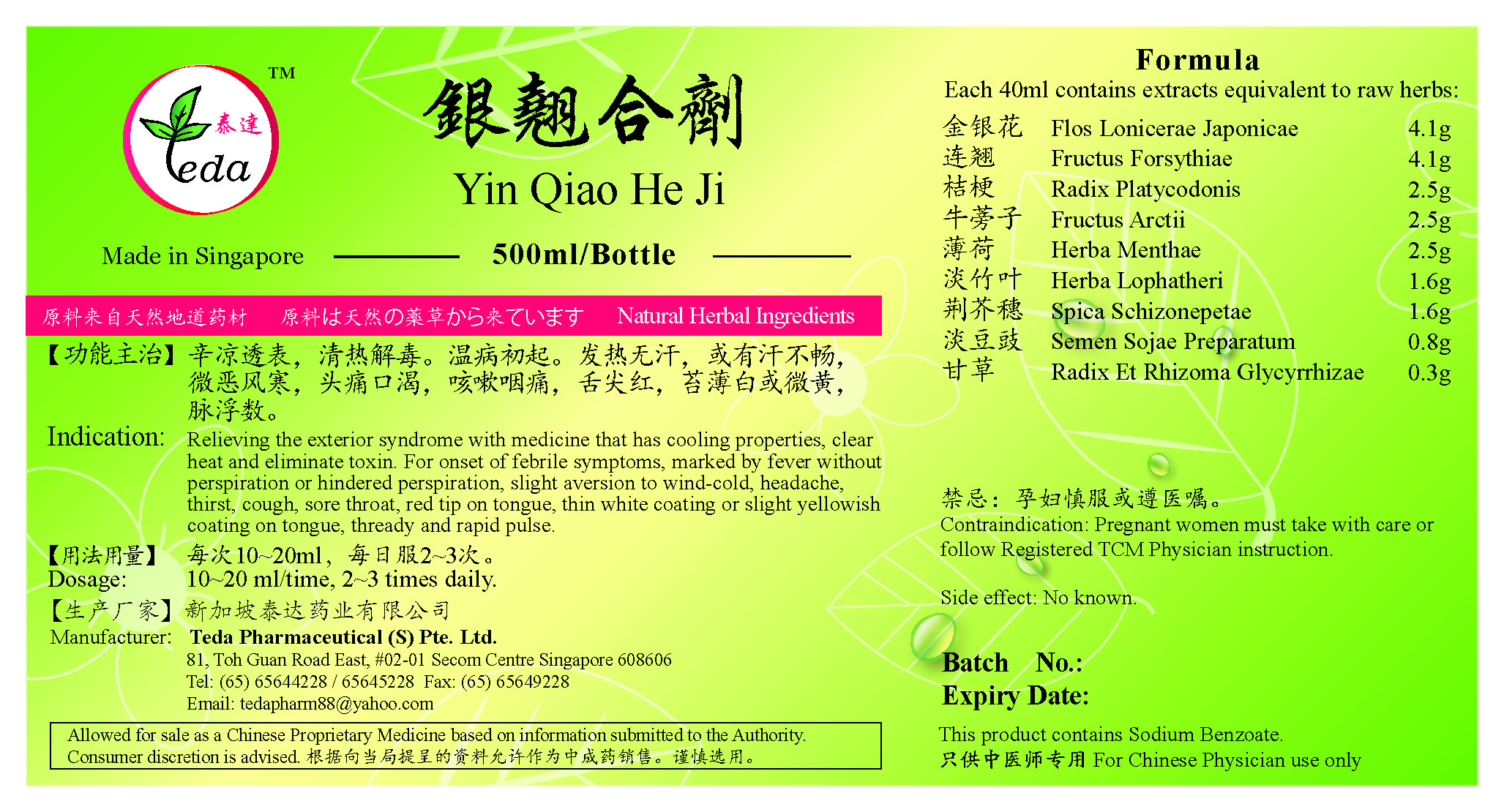 银翘合剂 Yin Qiao He Ji(500ml) (TYQ01A) Category: Liquid Preparations UOM: BOT 500ml 【功能主治】辛凉透表,清热解毒。温病初起。发热无汗,或有汗不畅,微恶风寒,头痛口渴,咳嗽咽痛,舌尖红,苔薄白或微黄,脉浮数。 Indication: Relieving the exterior syndrome with medicine that has cooling properties, clear heat and eliminate toxin. For onset of febrile symptoms, marked by fever without perspiration or hindered perspiration, slight aversion to wind-cold, headache, thirst, cough, sore throat, red tip on tongue, thin white coating or slight yellowish coating on tongue, thready and rapid pulse. Ingredients: 金银花 Flos Lonicerae Japonicae 连翘 Fructus Forsythiae 牛蒡子 Fructus Arctii 桔梗 Radix Platycodonis 薄荷 Herba Menthae 竹叶 Folium Phyllostachydis Henonis 荆芥穗 Spica Schizonepetae 淡豆豉 Semen Sojae Preparatum 甘草 Radix Glycyrrhizae SGD 10.20 |