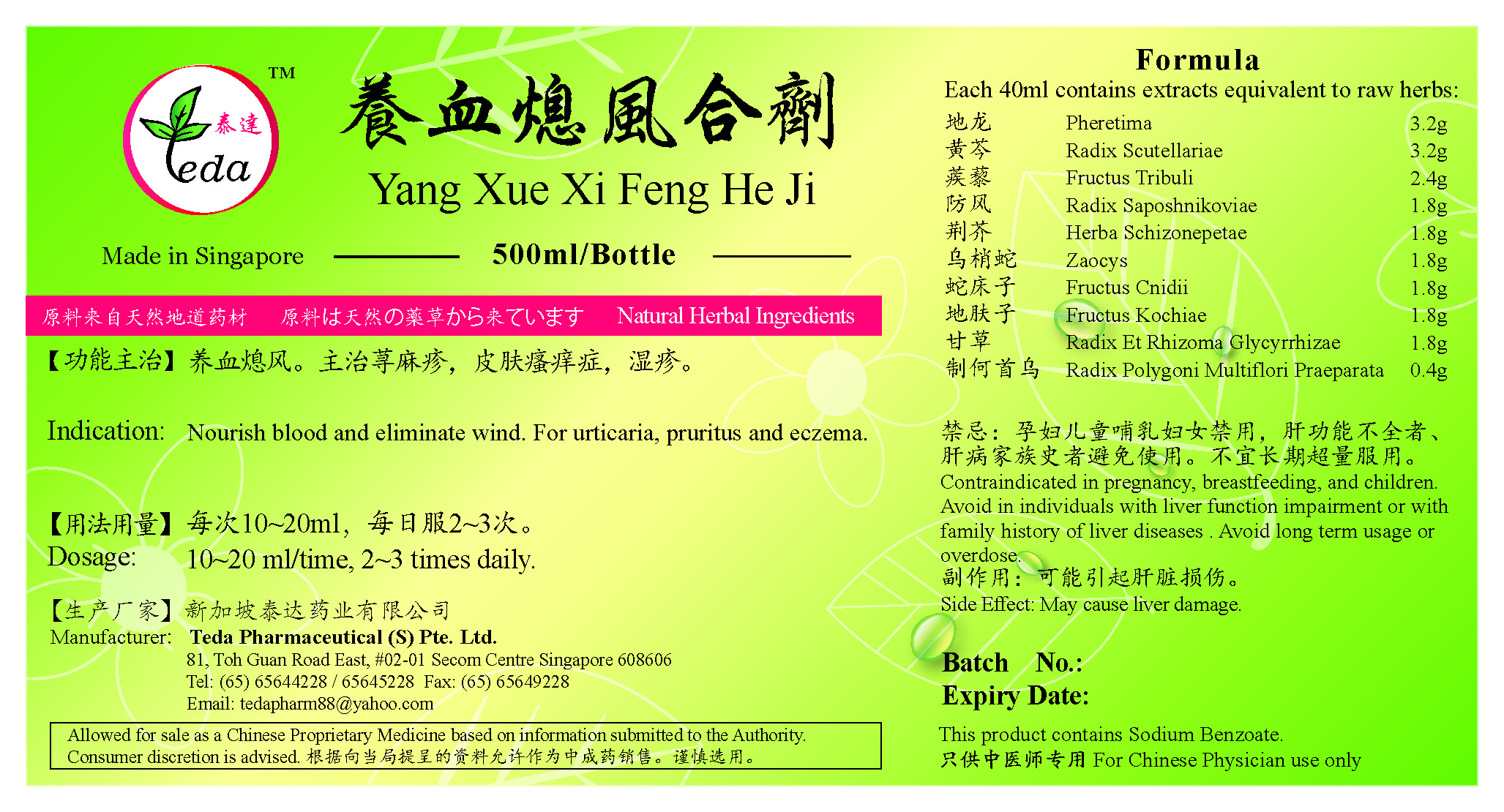 养血熄风合剂 Yang Xue Xi Feng He Ji(500ml) (TYX01) Category: Liquid Preparations UOM: BOT 500ml 【功能主治】养血熄风。主治急慢荨麻疹,皮肤瘙痒症,湿疹。 Indication: Nourish blood and eliminate wind. For urticaria, pruritus and eczema. Ingredients: 制何首乌 Radix Polygoni Multiflori Praeparata 防风 Radix Saposhnikoviae 蛇床子 Fructus Cnidii 地龙 Pheretima 甘草 Radix Et Rhizoma Glycyrrhizae 荆芥 Herba Schizonepetae 黄芩 Radix Scutellariae 地肤子 Fructus Kochiae 蒺藜 Fructus Tribuli 乌梢蛇 Zaocys SGD 13.00 |