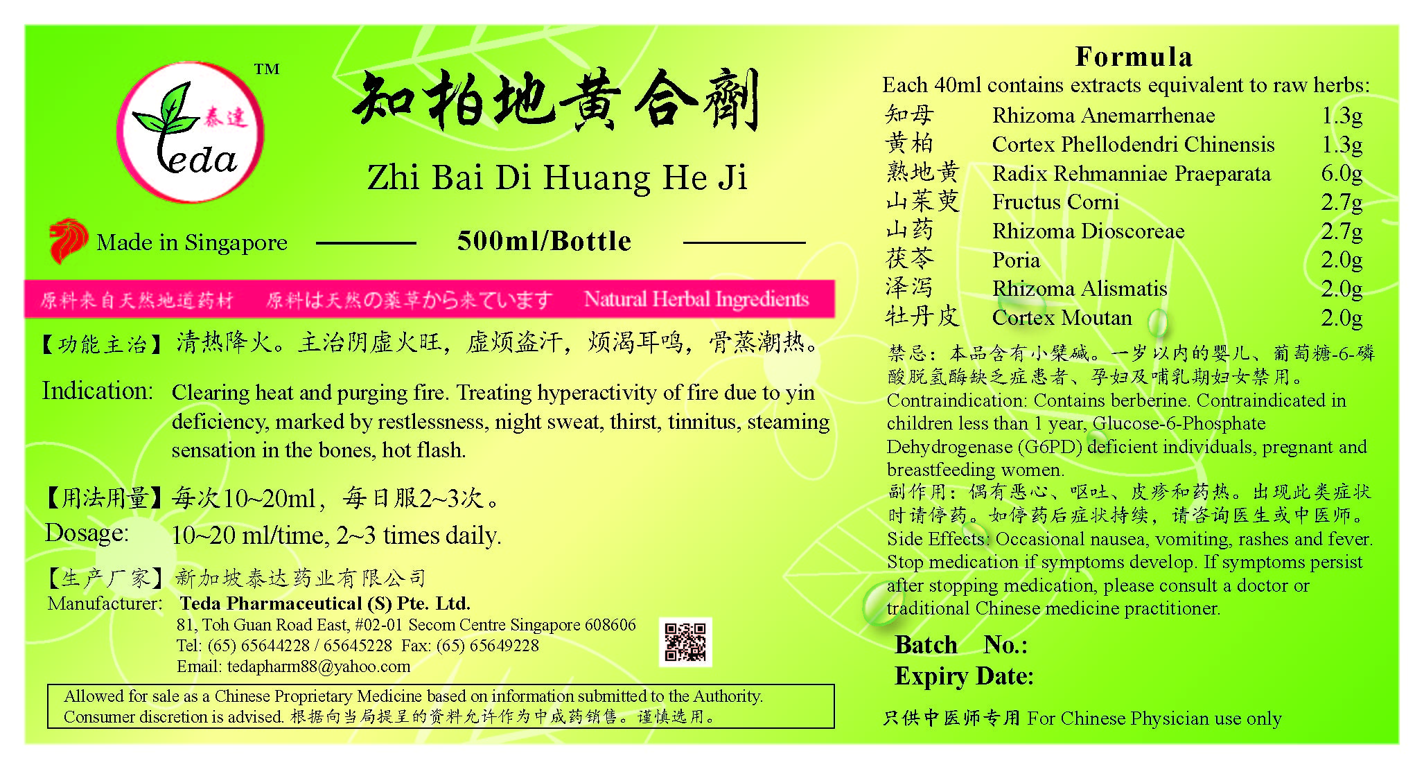 知柏地黄合剂 Zhi Bai Di Huang He Ji(500ml) (TZB01) Category: Liquid Preparations UOM: BOT 500ml 【功能主治】清热降火。主治阴虚火旺,虚烦盗汗,烦渴耳鸣,骨蒸潮热。 Indication: Clearing away heat and purging fire. Treating hyperactivity of fire due to yin deficiency, marked by restlessness, night sweat, thirst, tinnitus, steaming sensation in the bones, hectic fever. Ingredients: 知母 Rhizoma Anemarrhenae 黄柏 Cortex Phellodendri Chinensis 熟地黄 Radix Rehmanniae Praeparata 山茱萸 Fructus Corni 山药 Rhizoma Dioscoreae 茯苓 Poria 泽泻 Rhizoma Alismatis 牡丹皮 Cortex Moutan SGD 15.70 |