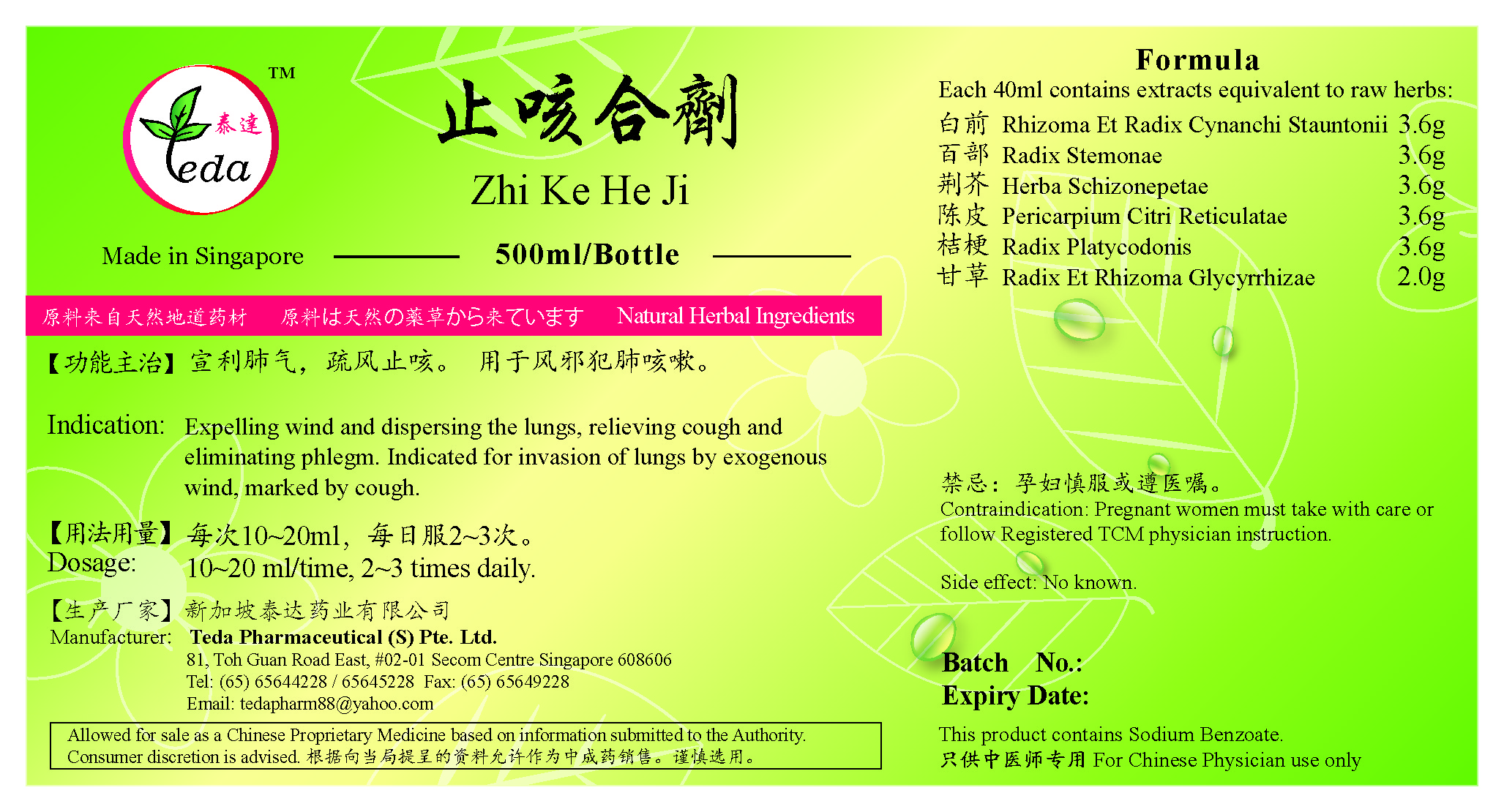 止咳合剂 Zhi Ke He Ji(500ml) (TZK01) Category: Liquid Preparations UOM: BOT 500ml 【功能主治】宣利肺气,疏风止咳。 用于风邪犯肺咳嗽。 Indication: Expelling wind and dispersing the lungs, relieving cough and eliminating phlegm. Indicated for invasion of lungs by exogenous wind, marked by cough. Ingredients: 荆芥 Herba Schizonepetae 百部 Radix Stemonae 桔梗 Radix Platycodonis 陈皮 Pericarpium Citri Reticulatae 白前 Rhizoma Et Radix Cynanchi Stauntonii 甘草 Radix Et Rhizoma Glycyrrhizae SGD 10.40 |