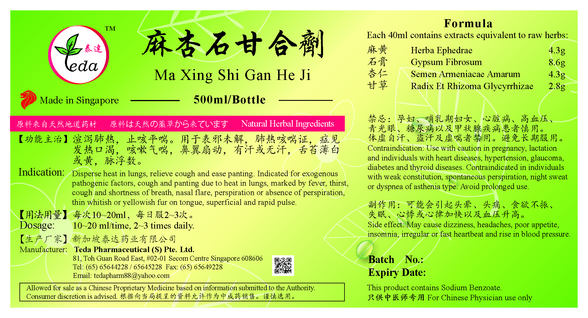 麻杏石甘合剂 Ma Xing Shi Gan He Ji(500ml) (TMX02) Category: Liquid Preparations UOM: BOT 500ml 【功能主治】渲泻肺热,止咳平喘。用于表邪未解,肺热咳喘证,症见发热口渴,咳嗽气喘,鼻翼扇动,口渴,有汗或无汗,舌苔薄白或黄,脉浮数。 Indication: Disperse heat in lungs, relieve cough and ease panting. Indicated for exogenous pathogenic factors, cough and panting due to heat in lungs, marked by fever, thirst, cough and shortness of breath, nasal flare, perspiration or absence of perspiration, thin whitish or yellowish fur on tongue, superficial and rapid pulse. Ingredients: 石膏 Gypsum Fibrosum 麻黄 Herba Ephedrae 杏仁 Semen Armeniacae Amarum 甘草 Radix Et Rhizoma Glycyrrhizae SGD 14.20 |