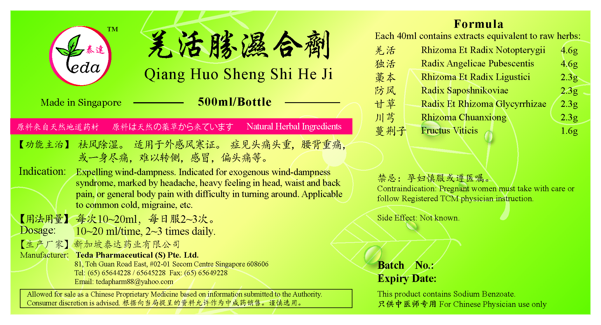 羌活胜湿合剂 Qiang Huo Sheng Shi He Ji(500ml) (TQH01) Category: Liquid Preparations UOM: BOT 500ml 【功能主治】祛风除湿。 适用于外感风寒证。 症见头痛头重, 腰背重痛,或一身尽痛,难以转侧,感冒,偏头痛等。 Indication: Expelling wind-dampness. Indicated for exogenous wind-dampness syndrome, marked by headache, heavy feeling in head, waist and back pain, or general body pain with difficulty in turning around. Applicable to common cold, migraine, etc. Ingredients: 羌活 Rhizoma Et Radix Notopterygii 独活 Radix Angelicae Pubescentis 藁本 Rhizoma Et Radix Ligustici 防风 Radix Saposhnikoviae 甘草 Radix Et Rhizoma Glycyrrhizae 川芎 Rhizoma Chuanxiong 蔓荆子 Fructus Viticis SGD 11.00 |