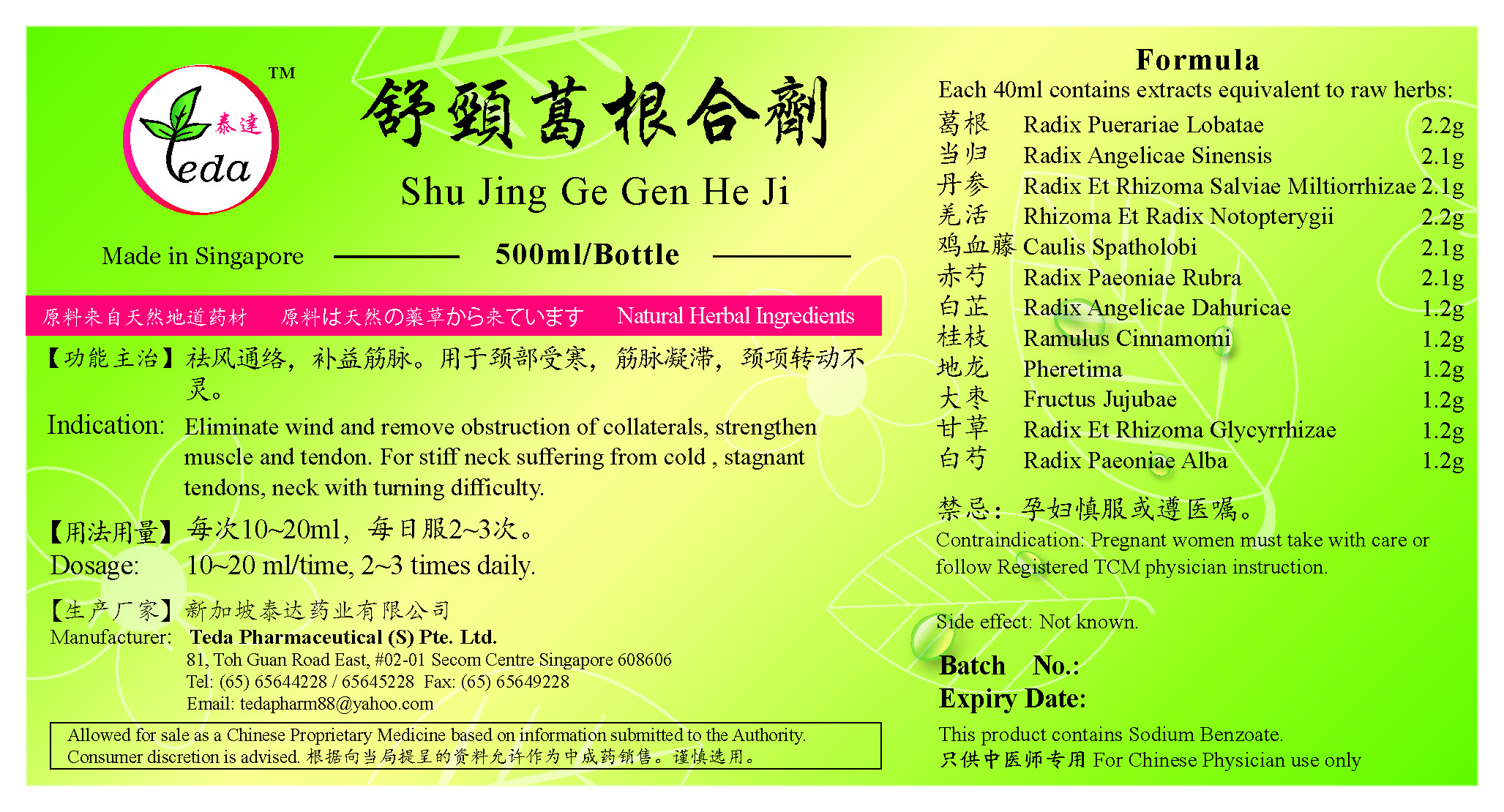 舒颈葛根合剂 Shu Jing Ge Gen He Ji(500ml) (TSJ04) Category: Liquid Preparations UOM: BOT 500ml 【功能主治】祛风通络,补益筋脉。用于颈部受寒,筋脉凝滞,颈项转动不灵。 Indication: Eliminate wind and remove obstruction of collaterals, strengthen muscle and tendon. For stiff neck suffering from cold, stagnant tendons, neck with turning difficulty. Ingredients: 葛根 Radix Puerariae Lobatae 当归 Radix Angelicae Sinensis 丹参 Radix Et Rhizoma Salviae Miltiorrhizae 羌活 Rhizoma Et Radix Notopterygii 鸡血藤 Caulis Spatholobi 赤芍 Radix Paeoniae Rubra 白芷 Radix Angelicae Dahuricae 桂枝 Ramulus Cinnamomi 地龙 Pheretima 大枣 Fructus Jujubae 甘草 Radix Et Rhizoma Glycyrrhizae 白芍 Radix Paeoniae Alba SGD 12.40 |