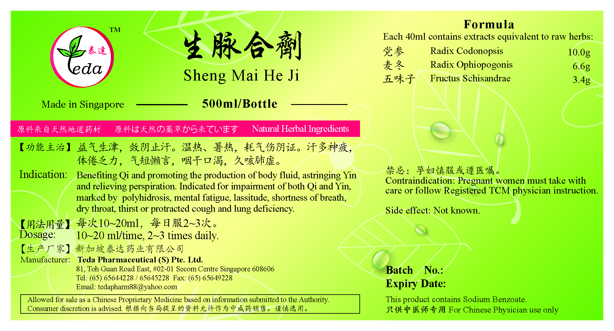 生脉合剂 Sheng Mai He Ji(500ml) (TSM03) Category: Liquid Preparations UOM: BOT 500ml 【功能主治】益气生津,敛阴止汗。温热、暑热,耗气伤阴证。汗多神疲,体倦乏力,气短懒言,咽干口渴,久咳肺虚。 Indication: Benefiting Qi and promoting the production of body fluid, astringing Yin and relieving perspiration. Indicated for impairment of both Qi and Yin, marked by polyhidrosis, mental fatigue, lassitude, shortness of breath, dry throat, thirst or protracted cough and lung deficiency. Ingredients: 党参 Radix Codonopsis 麦冬 Radix Ophiopogonis 五味子 Fructus Schisandrae SGD 10.70 |