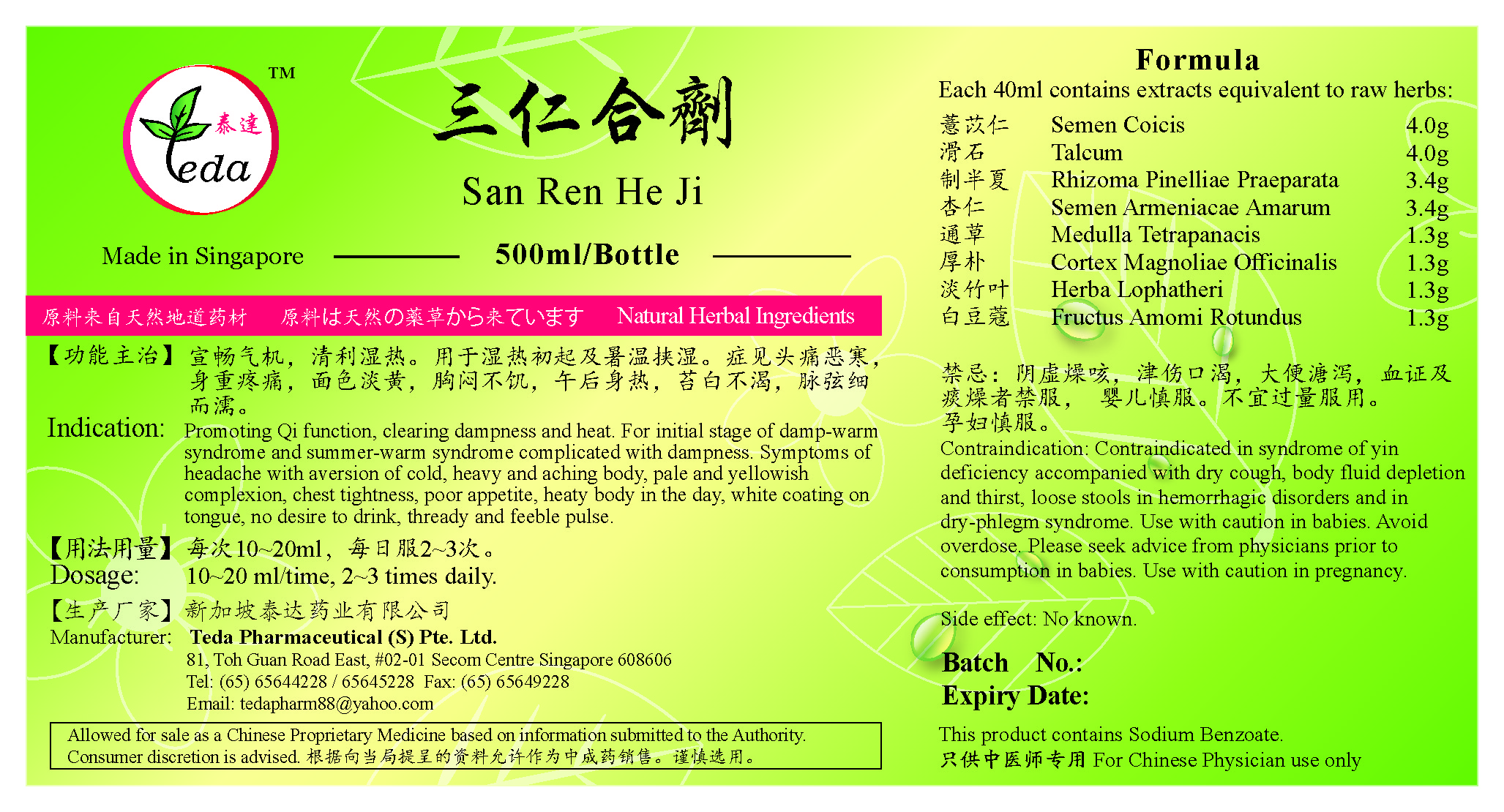 三仁合剂 San Ren He Ji(500ml) (TSR01) Category: Liquid Preparations UOM: BOT 500ml 【功能主治】宣畅气机,清利湿热。用于湿热初起及暑温挟湿。症见头痛恶寒,身重疼痛,面色淡黄,胸闷不饥,午后身热,苔白不渴,脉弦细而濡。 Indication: Promoting Qi function, clearing dampness and heat. For initial stage of damp-warm syndrome and summer-warm syndrome complicated with dampness. Symptoms of headache with aversion of cold, heavy and aching body, pale and yellowish complexion, chest tightness, poor appetite, heaty body in the day, white coating on tongue, no desire to drink, thready and feeble pulse. Ingredients: 薏苡仁 Semen Coicis 滑石 Talcum 杏仁 Semen Armeniacae Amarum 制半夏 Rhizoma Pinelliae Praeparata 通草 Medulla Tetrapanacis 白豆蔻 Fructus Amomi Rotundus 淡竹叶 Herba Lophatheri 厚朴 Cortex Magnoliae Officinalis SGD 12.40 |
