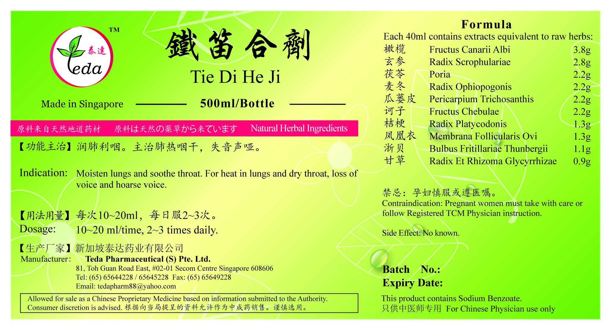 铁笛合剂 Tie Di He Ji(500ml) (TTD01) Category: Liquid Preparations UOM: BOT 【功能主治】润肺利咽。主治肺热咽干,失音声哑。 Indication: Moisten lungs and soothe throat. For heat in lungs and dry throat, loss of voice and hoarse voice. Ingredients: 诃子 Fructus Chebulae 凤凰衣 Membrana Follicularis Ovi 玄参 Radix Scrophulariae 桔梗 Radix Platycodonis 茯苓 Poria 麦冬 Radix Ophiopogonis 橄榄 Fructus Canarii Albi 瓜蒌皮 Pericarpium Trichosanthis 浙贝 Bulbus Fritillariae Thunbergii 甘草 Radix Et Rhizoma Glycyrrhizae SGD 13.40 |