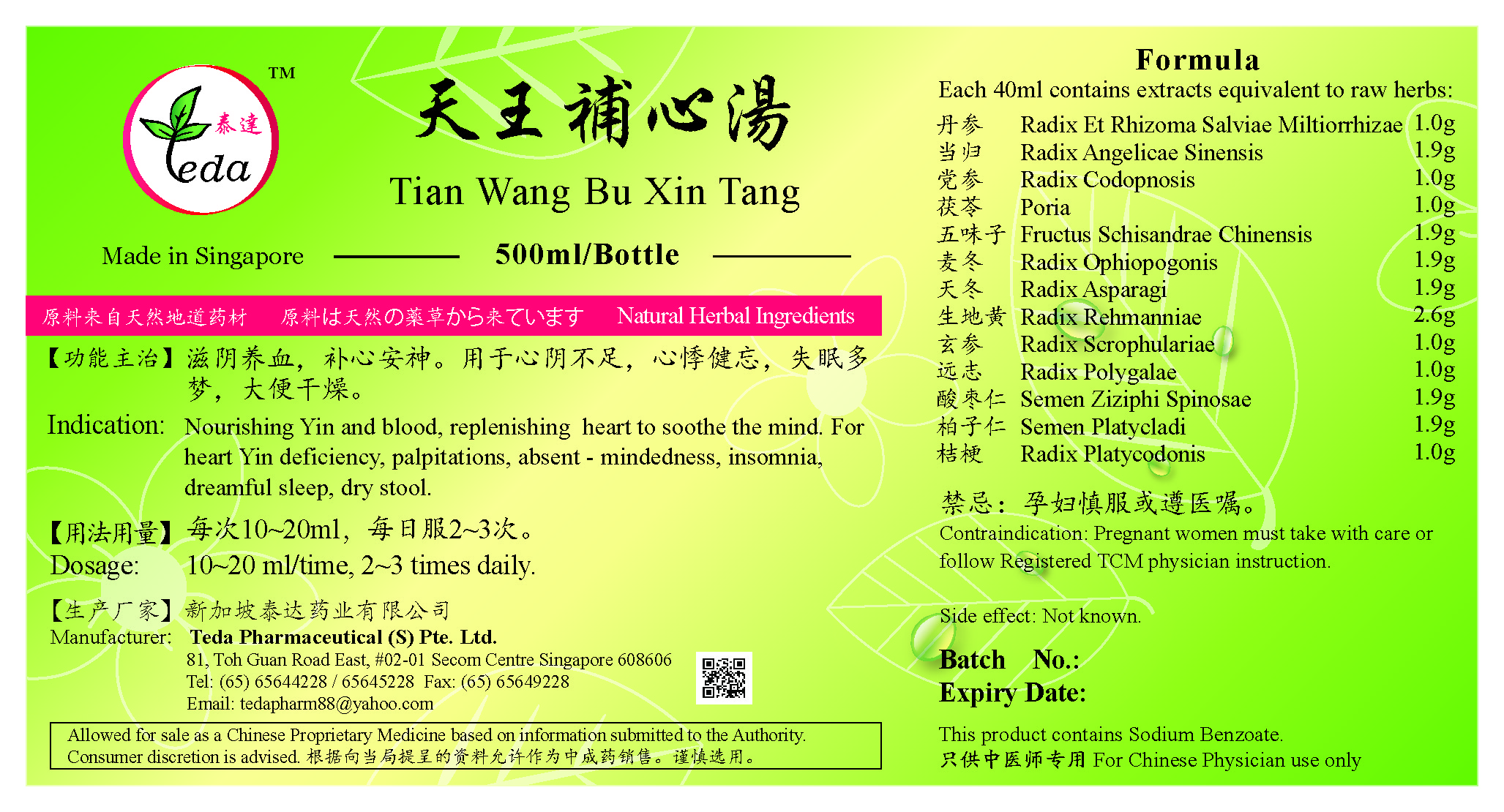 天王补心汤 Tian Wang Bu Xin Tang(500ml) (TTW01) Category: Liquid Preparations UOM: BOT 500ml 【功能主治】滋阴养血,补心安神。用于心阴不足,心悸健忘,失眠多梦,大便干燥。 Indication: Nourishing Yin and blood, replenishing heart to soothe the mind. For heart Yin deficiency, palpitations, absent - mindedness, insomnia, dreamful sleep, dry stool. Ingredients: 丹参 Radix Et Rhizoma Salviae Miltiorrhizae 当归 Radix Angelicae Sinensis 党参 Radix Codonopsis 茯苓 Poria 五味子 Fructus Schisandrae 麦冬 Radix Ophiopogonis 天冬 Radix Asparagi 生地黄 Radix Rehmanniae 玄参 Radix Scrophulariae 远志 Radix Polygalae 酸枣仁 Semen Ziziphi Spinosae 柏子仁 Semen Platycladi 桔梗 Radix Platycodonis SGD 10.30 |