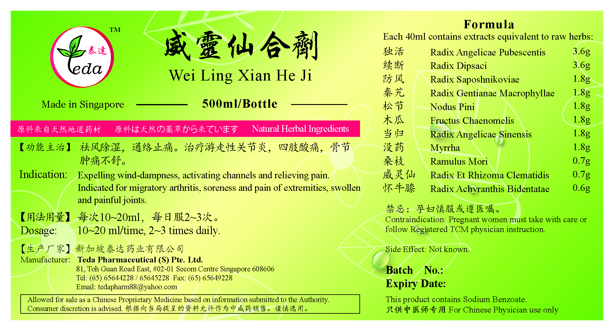 威灵仙合剂 Wei Ling Xian He Ji(500ml) (TWL02) Category: Liquid Preparations UOM: BOT 500ml 【功能主治】祛风除湿,通络止痛。治疗游走性关节炎,四肢酸痛,骨节肿痛不舒。 Indication: Expelling wind-dampness, activating channels and relieving pain. Indicated for migratory arthritis, soreness and pain of extremities, swollen and painful joints. Ingredients: 独活 Radix Angelicae Pubescentis 续断 Radix Dipsaci 防风 Radix Saposhnikoviae 秦艽 Radix Gentianae Macrophyllae 松节 Nodus Pini 木瓜 Fructus Chaenomelis 当归 Radix Angelicae Sinensis 没药 Myrrha 桑枝 Ramulus Mori 威灵仙 Radix Et Rhizoma Clematidis 怀牛膝 Radix Achyranthis Bidentatae SGD 14.20 |