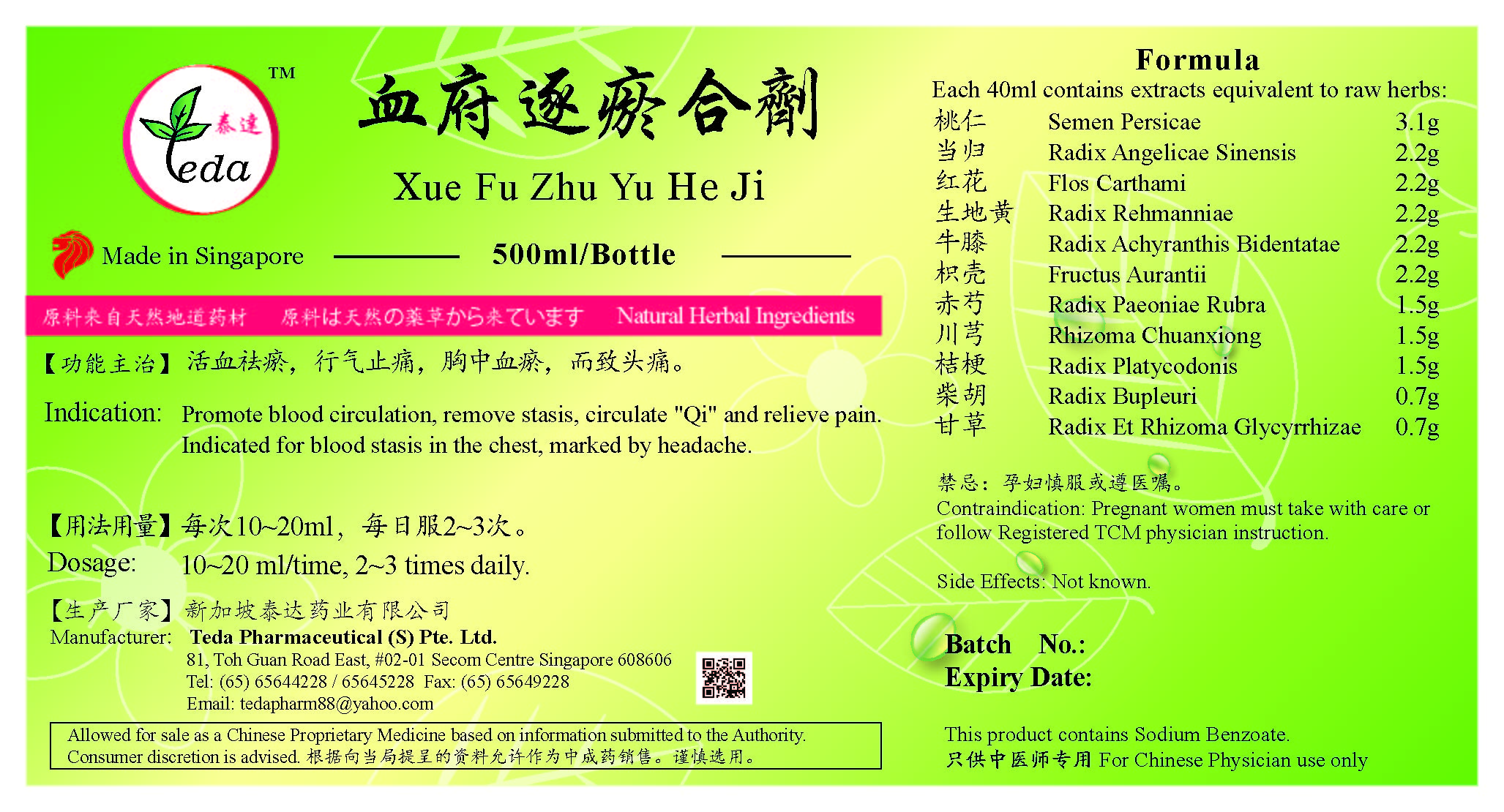 血府逐瘀合剂 Xue Fu Zhu Yu He Ji(500ml) (TXF03) Category: Liquid Preparations UOM: BOT 500ml 【功能主治】活血祛瘀,行气止痛,胸中血瘀,而致头痛。胸痛日久不愈,痛如针刺,且有定处。 Indication: Promote blood circulation, remove stasis, circulate "Qi" and relieve pain. Blood stasis in the chest, marked by headache and long lasting sharp pain in the chest with fixed location. Ingredients: 桃仁 Semen Persicae 当归 Radix Angelicae Sinensis 红花 Flos Carthami 生地黄 Radix Rehmanniae 怀牛膝 Radix Achyranthis Bidentatae 枳壳 Fructus Aurantii 赤芍 Radix Paeoniae Rubra 川芎 Rhizoma Chuanxiong 桔梗 Radix Platycodonis 柴胡 Radix Bupleuri 甘草 Radix Et Rhizoma Glycyrrhizae SGD 12.40 |