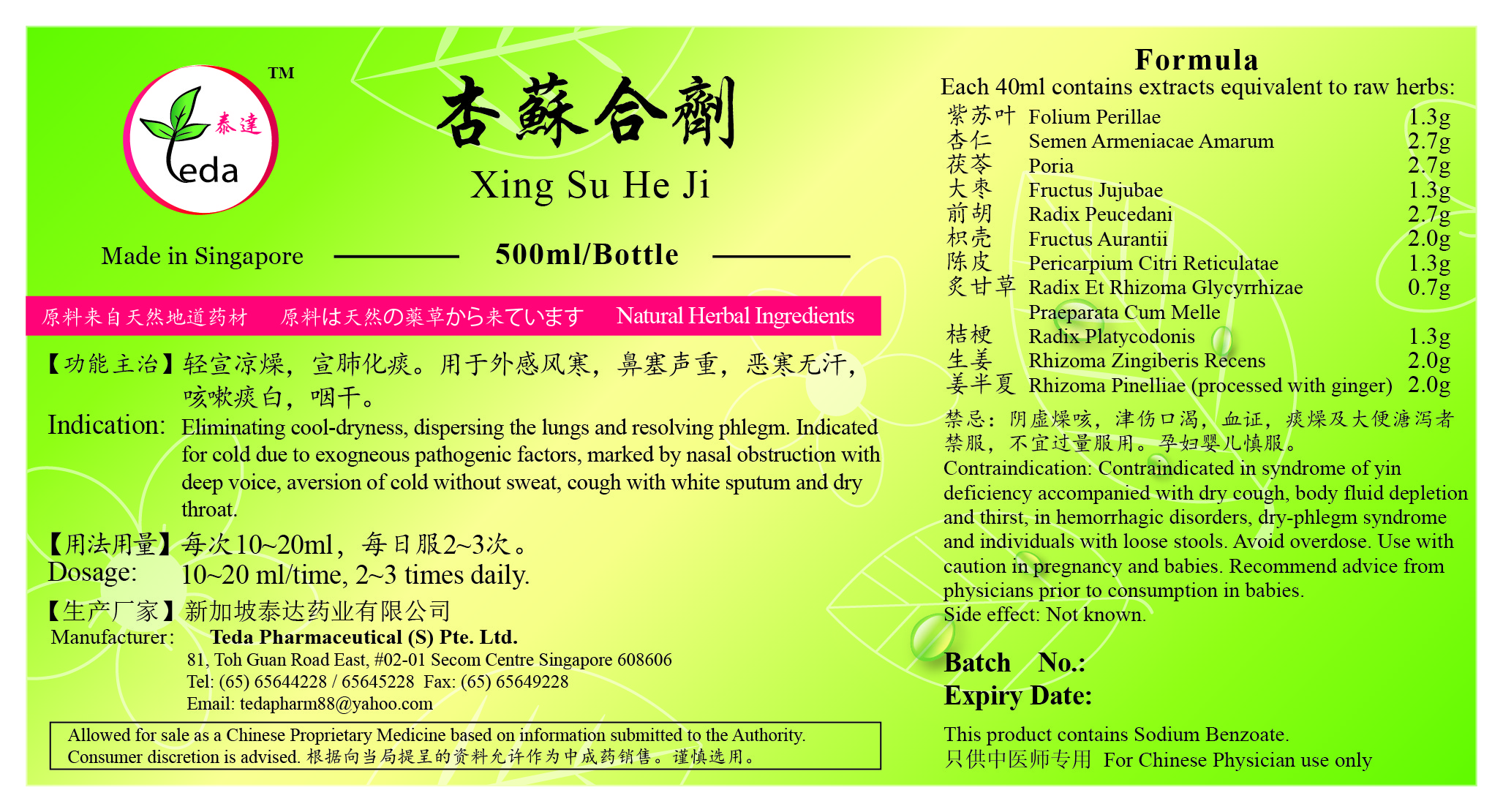 杏苏合剂 Xing Shu He Ji(500ml) (TXS01) Category: Liquid Preparations UOM: BOT 500ml 【功能主治】轻宣凉燥,宣肺化痰。用于外感风寒,鼻塞声重,恶寒无汗,咳嗽痰白,咽干。 Indication: Eliminating cool-dryness, dispersing the lung and resolving phlegm. Indicated for cool-dryness, syndrome due to exogneous pathogenic factors, marked by aversion of cold without sweat, slight headache, cough with white sputum, nasal obstruction and dryness of throat. Ingredients: 紫苏叶 Folium Perillae 杏仁 Semen Armeniacae Amarum 茯苓 Poria 大枣 Fructus Jujubae 前胡 Radix Peucedani 枳壳 Fructus Aurantii 陈皮 Pericarpium Citri Reticulatae 炙甘草 Radix Et Rhizoma Glycyrrhizae Praeparata Cum Melle 桔梗 Radix Platycodonis 生姜 Rhizoma Zingiberis Recens 姜半夏 Rhizoma Pinelliae (processed with ginger) SGD 12.30 |