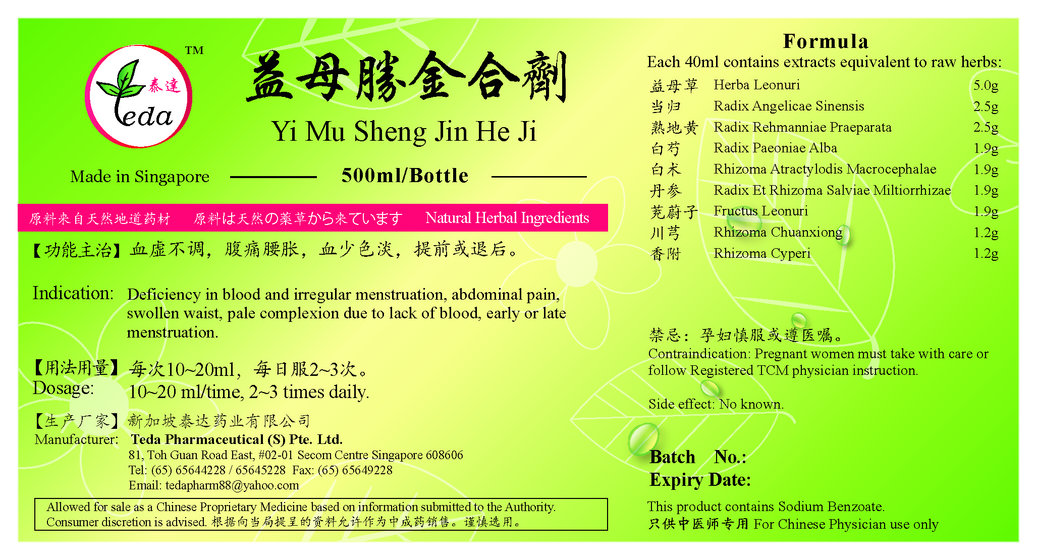 益母胜金合剂 Yi Mu Sheng Jin He Ji(500ml) (TYM01) Category: Liquid Preparations UOM: BOT 500ml 【功能主治】血虚不调,腹痛腰胀,血少色淡,提前或退后。 Indication: Deficiency in blood and irregular menstruation, abdominal pain, swollen waist, pale complexion due to lack of blood, early or late menstruation. Ingredients: 熟地黄 Radix Rehmanniae Praeparata 当归 Radix Angelicae Sinensis 白术 Rhizoma Atractylodis Macrocephalae 川芎 Rhizoma Chuanxiong 丹参 Radix Et Rhizoma Salviae Miltiorrhizae 香附 Rhizoma Cyperi 白芍 Radix Paeoniae Alba 茺蔚子 Fructus Leonuri 益母草 Herba Leonuri SGD 13.40 |