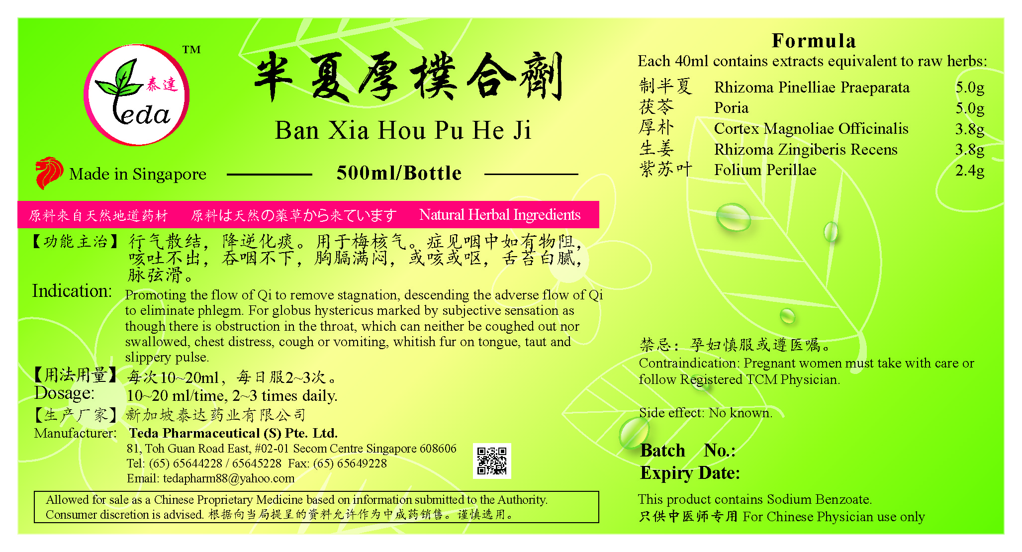 半夏厚朴合剂 Ban Xia Hou Pu He Ji(500ml) (TBX01) Category: Liquid Preparations UOM: BOT 500ml 【功能主治】行气散结,降逆化痰。用于梅核气。症见咽中如有物阻,咳吐不出,吞咽不下,胸膈满闷,或咳或呕,舌苔白腻,脉弦滑。 Indication: Promoting the flow of Qi to remove stagnation, descending the adverse flow of Qi to eliminate phlegm. For globus hystericus marked by subjective sensation as though there is obstruction in the throat, which can neither be coughed out nor swallowed, chest distress, cough or vomiting, whitish fur on tongue, taut and slippery pulse. Ingredients: 制半夏 Rhizoma Pinelliae Praeparata 厚朴 Cortex Magnoliae Officinalis 茯苓 Poria 生姜 Rhizoma Zingiberis Recens 紫苏叶 Folium Perillae SGD 12.00 |