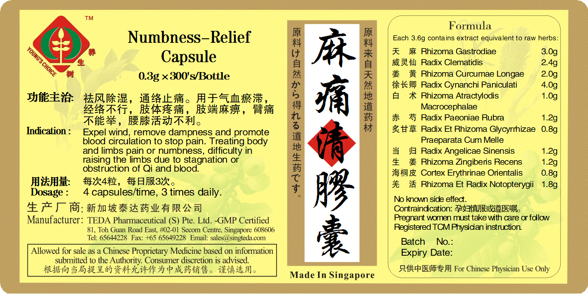 麻痛清胶囊 Numbness - Relief Capsule (300's) (JMT01) Category: Capsule UOM: BOT 【功能主治】 祛风除湿,通络止痛。用于气血瘀滞,经络不行,肢体疼痛,肢端麻痹,臂痛不能举,腰膝活动不利。 Indication: Expel wind, remove dampness and promote blood circulation to stop pain. Treating body and limbs pain or numbness, difficulty in raising the limbs due to stagnation or obstruction of Qi and blood. Ingredients: 天麻 Rhizoma Gastrodiae 威灵仙 Radix Clematidis 姜黄 Rhizoma Curcumae Longae 徐长卿 Radix Cynanchi Paniculati 白术 Rhizoma Atractylodis Macrocephalae 赤芍 Radix Paeoniae Rubra 炙甘草 Radix Et Rhizoma Glycyrrhizae Praeparata Cum Melle 当归 Radix Angelicae Sinensis 生姜 Rhizoma Zingiberis Recens 海桐皮 Cortex Erythrinae Orientalis 羌活 Rhizoma Et Radix Notopterygii SGD 41.25 |