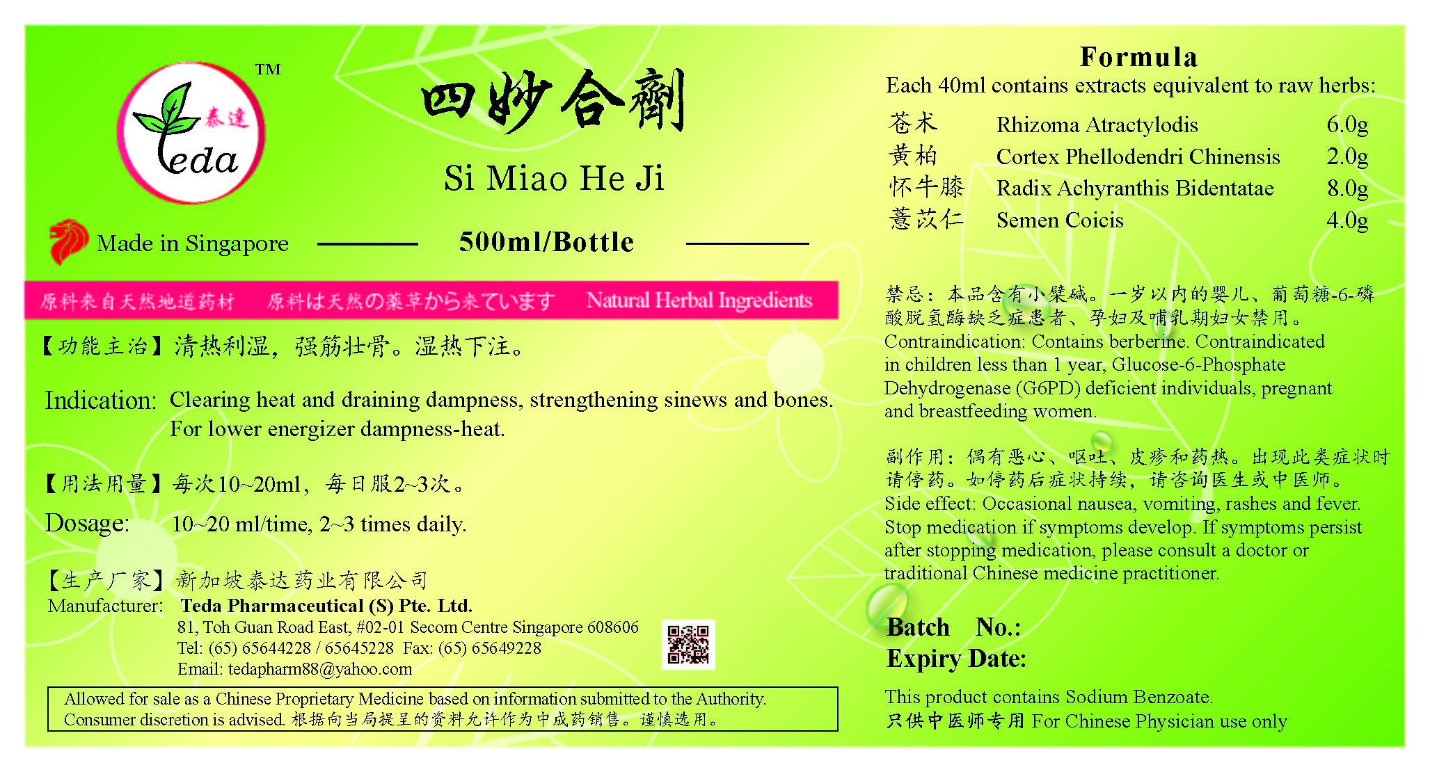 四妙合剂 Si Miao He Ji(500ml) (TSM01) Category: Liquid Preparations UOM: BOT 500ml 【功能主治】清热利湿,强筋壮骨。湿热下注。 Indication: Clearing heat and draining dampness, strengthening sinews and bones. For lower energizer dampness-heat. Ingredients: 苍术 Rhizoma Atractylodis 黄柏 Cortex Phellodendri Chinensis 怀牛膝 Radix Achyranthis Bidentatae 薏苡仁 Semen Coicis SGD 13.20 |