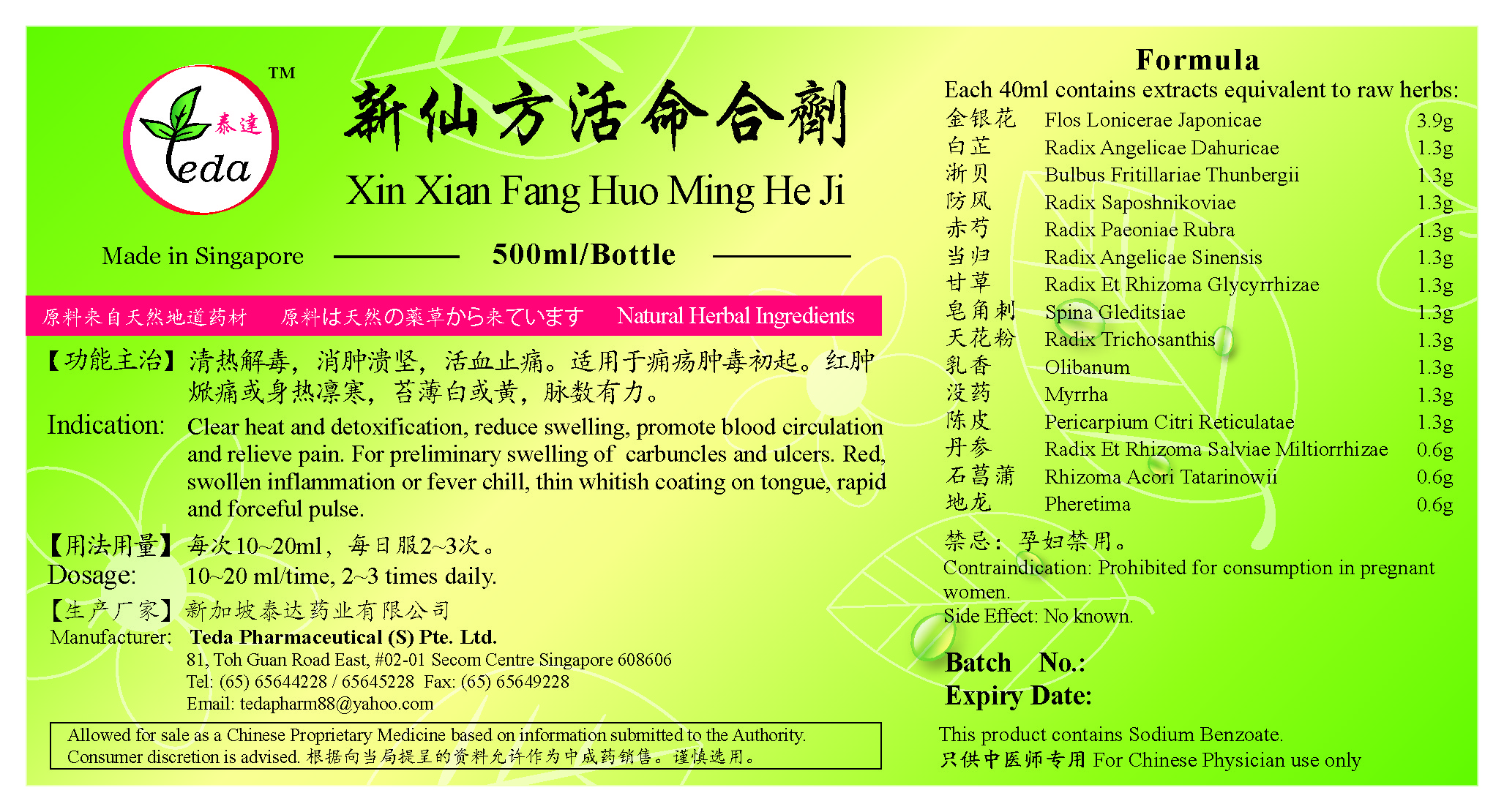 新仙方活命合剂 Xin Xian Fang Huo Ming He Ji(500ml) (TXF01) Category: Liquid Preparations UOM: BOT 500ml 【功能主治】清热解毒,消肿溃坚,活血止痛。适用于痈疡肿毒初起。红肿焮痛或身热凛寒,苔薄白或黄,脉数有力。 Indication: Clear heat and detoxification, reduce swelling, promote blood circulation and relieve pain. For preliminary swelling of carbuncles and ulcers. Red, swollen inflammation or fever chill, thin whitish coating on tongue, rapid and forceful pulse. Ingredients: 白芷 Radix Angelicae Dahuricae 浙贝 Bulbus Fritillariae Thunbergii 防风 Radix Saposhnikoviae 赤芍 Radix Paeoniae Rubra 当归 Radix Angelicae Sinensis 甘草 Radix Et Rhizoma Glycyrrhizae 皂角刺 Spina Gleditsiae 丹参 Radix Et Rhizoma Salviae Miltiorrhizae 石菖蒲 Rhizoma Acori Tatarinowii 天花粉 Radix Trichosanthis 乳香 Olibanum 没药 Myrrha 地龙 Pheretima 金银花 Flos Lonicerae Japonicae 陈皮 Pericarpium Citri Reticulatae SGD 15.20 |