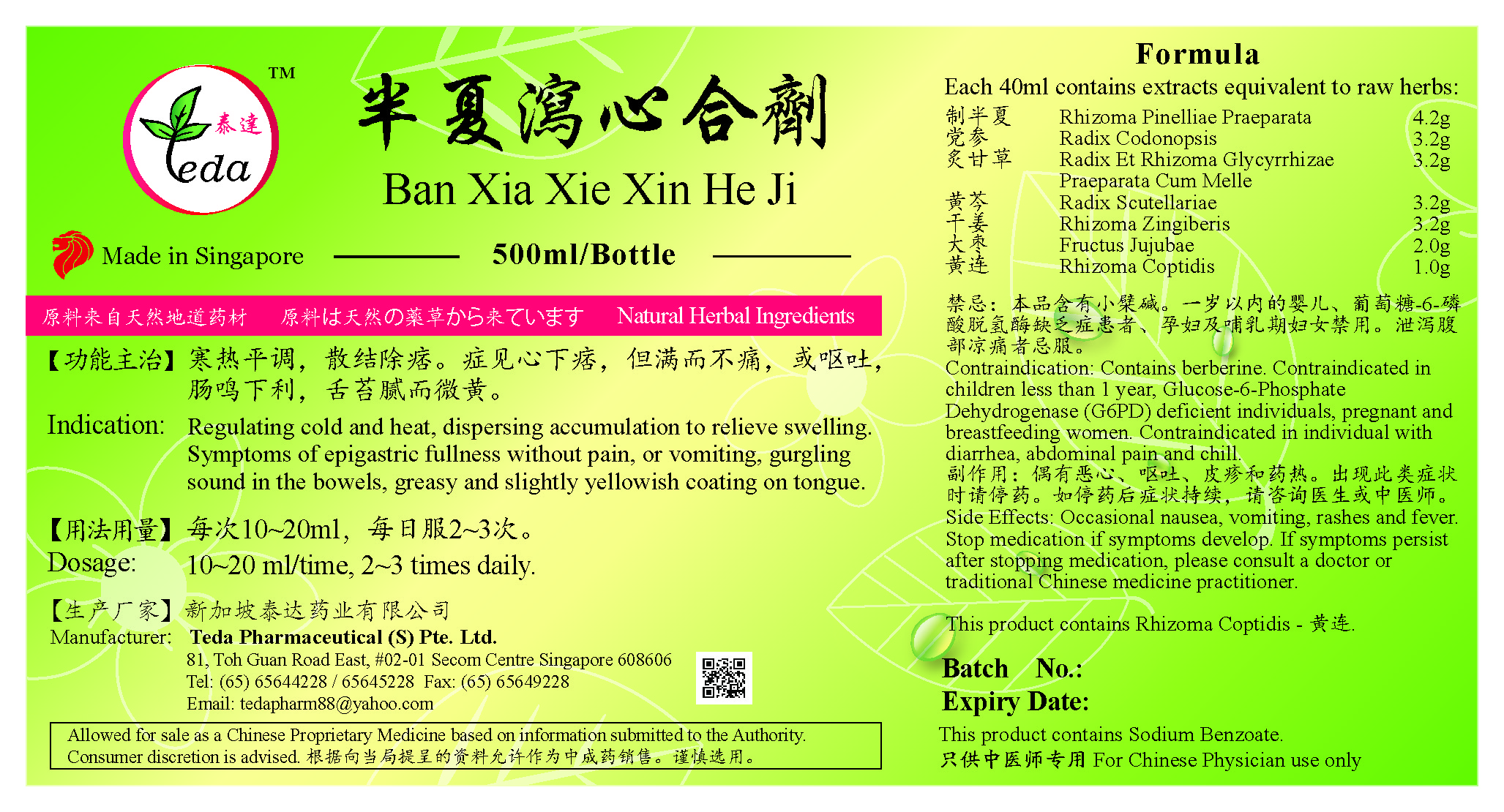 半夏泻心合剂 Ban Xia Xie Xin He Ji(500ml) (TBX03) Category: Liquid Preparations UOM: BOT 500ml 【功能主治】寒热平调,散结除痞。症见心下痞,但满而不痛,或呕吐,肠鸣下利,舌苔腻而微黄。 Indication: Regulating cold and heat, dispersing accumulation to relieve swelling. Symptoms of epigastric fullness without pain, or vomiting, gurgling sound in the bowels, greasy and slightly yellowish coating on tongue. Ingredients: 制半夏 Rhizoma Pinelliae Praeparata 党参 Radix Codonopsis 炙甘草 Radix Et Rhizoma Glycyrrhizae Praeparata Cum Melle 黄芩 Radix Scutellariae 干姜 Rhizoma Zingiberis 大枣 Fructus Jujubae 黄连 Rhizoma Coptidis SGD 14.40 |