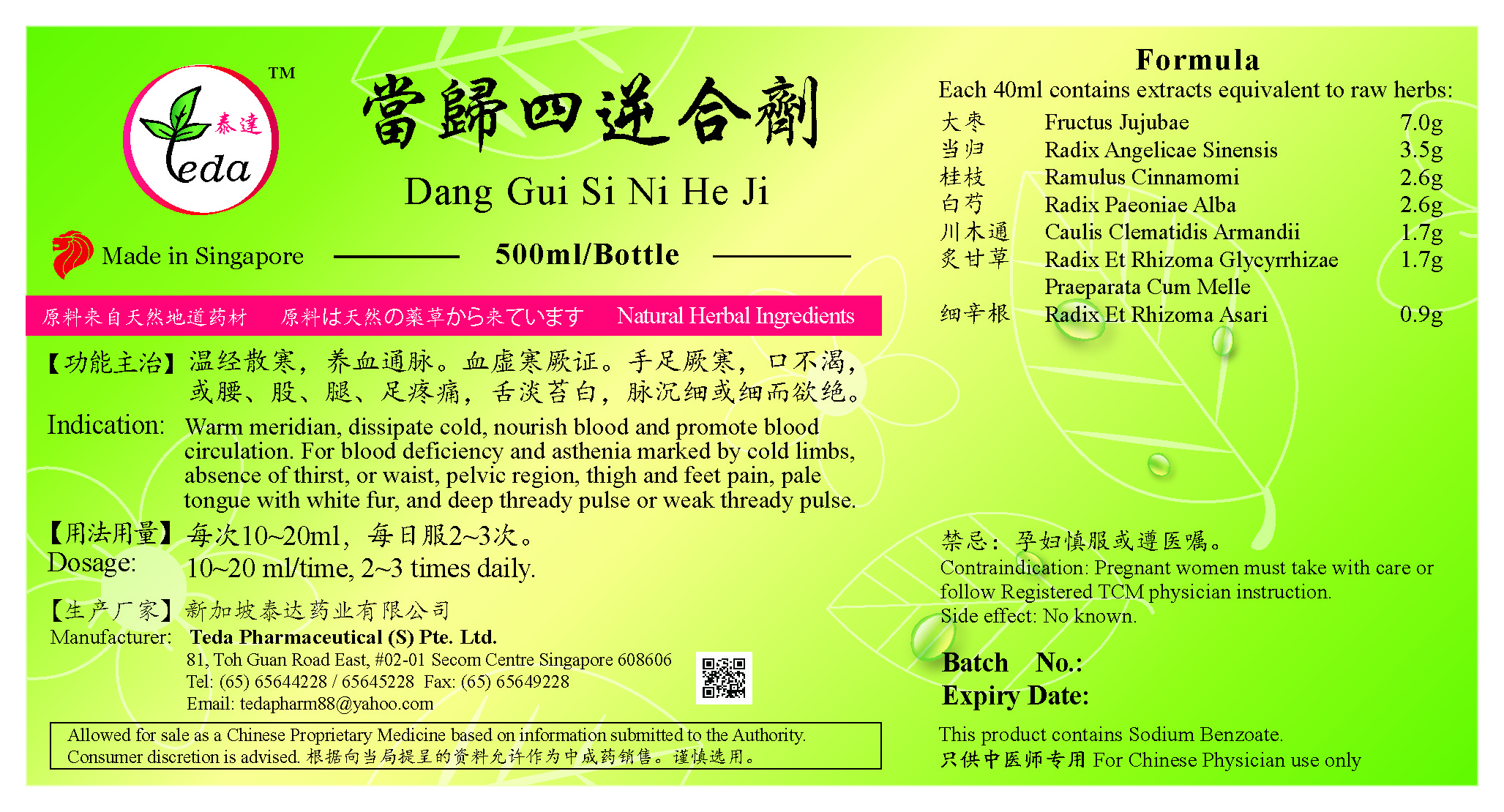当归四逆合剂 Dang Gui Si Ni He Ji(500ml) (TDG01) Category: Liquid Preparations UOM: BOT 500ml 【功能主治】温经散寒,养血通脉。血虚寒厥证。手足厥寒,口不渴,或腰、股、腿、足疼痛,舌淡苔白,脉沉细或细而欲绝。 Indication: Warm meridian, dissipate cold, nourish blood and promote blood circulation. For blood deficiency and asthenia marked by cold limbs,absence of thirst, or waist, pelvic region, thigh and feet pain, pale tongue with white fur, and deep thready pulse or weak thready pulse. Ingredients: 当归 Radix Angelicae Sinensis 桂枝 Ramulus Cinnamomi 白芍 Radix Paeoniae Alba 细辛根 Radix Et Rhizoma Asari 炙甘草 Radix Et Rhizoma Glycyrrhizae Praeparata Cum Melle 川木通 Caulis Clematidis Armandii 大枣 Fructus Jujubae SGD 12.30 |