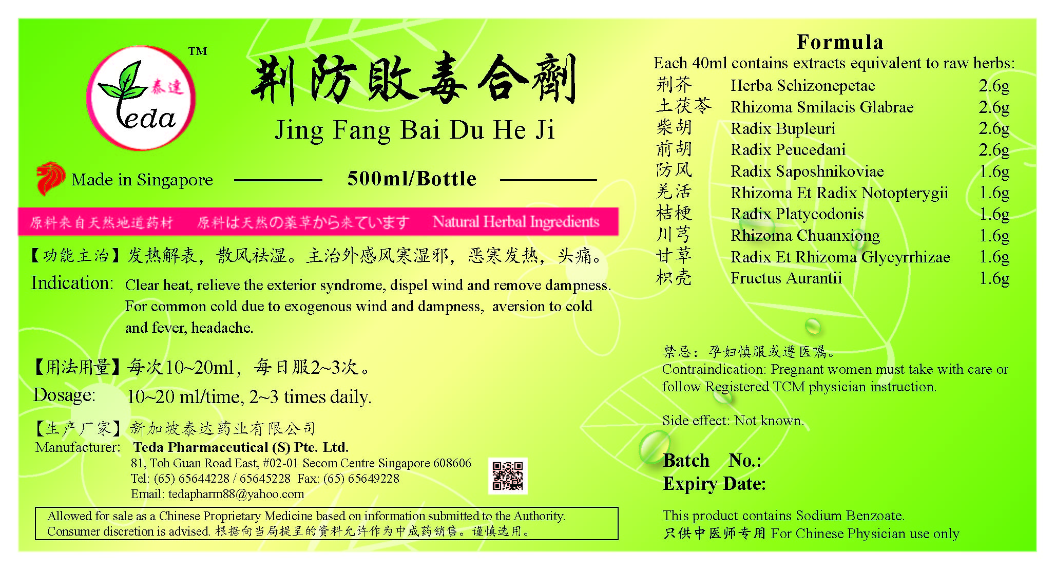 荆防败毒合剂 Jing Fang Bai Du He Ji(500ml) (TJF01) Category: Liquid Preparations UOM: BOT 500ml 【功能主治】清热散风,解毒消肿。用于流行性感冒,恶寒发热,头痛咳嗽。 Indication: Clearing away heat and toxins and resolving mass. Applicable to common cold, aversion to cold and fever, headache and cough. Ingredients: 荆芥 Herba Schizonepetae 土茯苓 Rhizoma Smilacis Glabrae 柴胡 Radix Bupleuri 前胡 Radix Peucedani 防风 Radix Saposhnikoviae 羌活 Rhizoma Et Radix Notopterygii 桔梗 Radix Platycodonis 川芎 Rhizoma Chuanxiong 甘草 Radix Et Rhizoma Glycyrrhizae 枳壳 Fructus Aurantii SGD 11.40 |