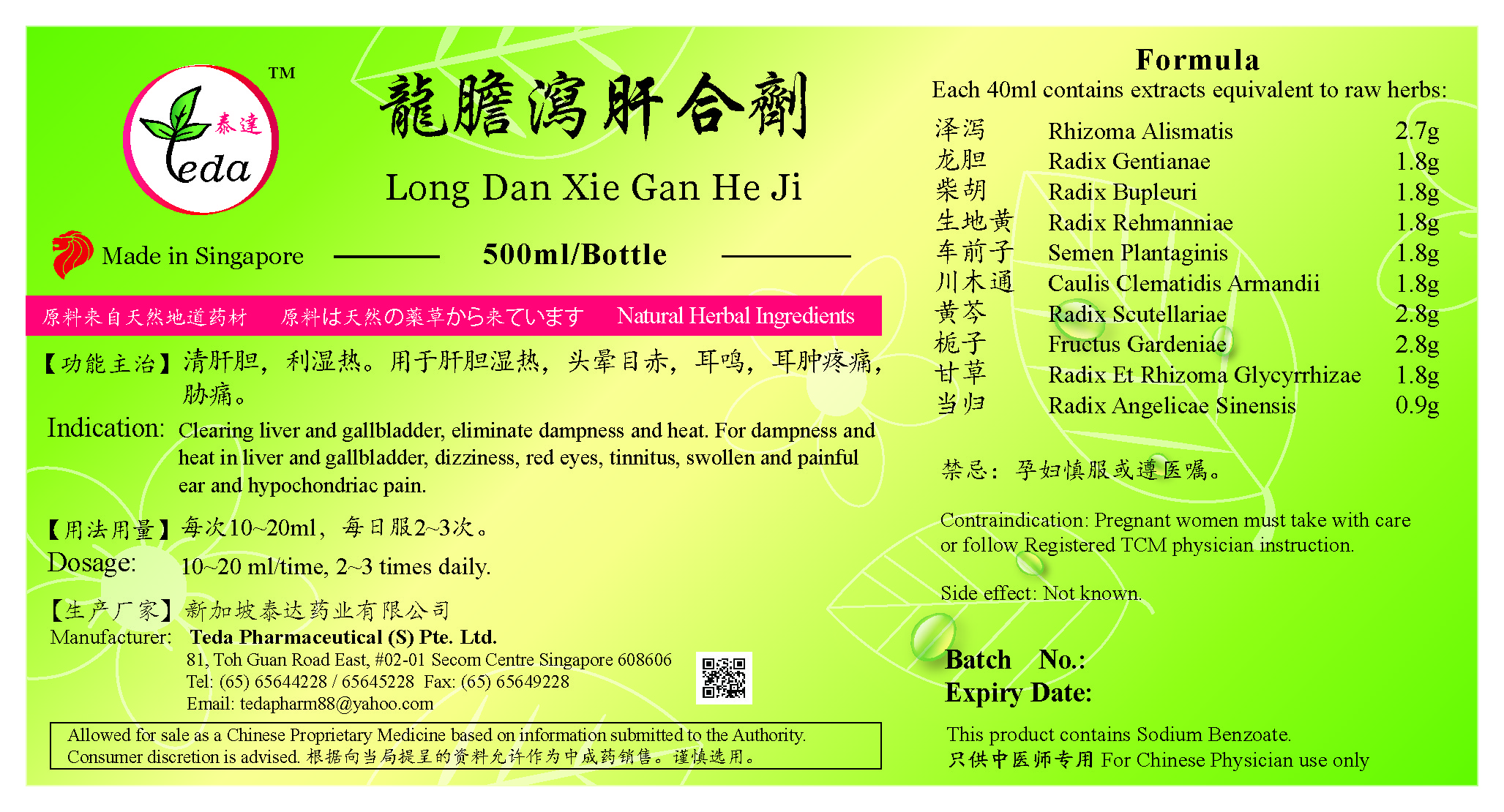 龙胆泻肝合剂 Long Dan Xie Gan He Ji(500ml) (TLD01) Category: Liquid Preparations UOM: BOT 500ml 【功能主治】清肝胆,利湿热。用于肝胆湿热,头晕目赤,耳鸣,耳肿疼痛,胁痛。 Indication: Clearing liver and gallbladder, eliminate dampness and heat. For dampness and heat in liver and gallbladder, dizziness, red eyes, tinnitus, swollen and painful ear and hypochondriac pain. Ingredients: 泽泻 Rhizoma Alismatis 龙胆 Radix Gentianae 柴胡 Radix Bupleuri 生地黄 Radix Rehmanniae 车前子 Semen Plantaginis 川木通 Caulis Clematidis Armandii 黄芩 Radix Scutellariae 栀子 Fructus Gardeniae 甘草 Radix Et Rhizoma Glycyrrhizae 当归 Radix Angelicae Sinensis SGD 10.20 |