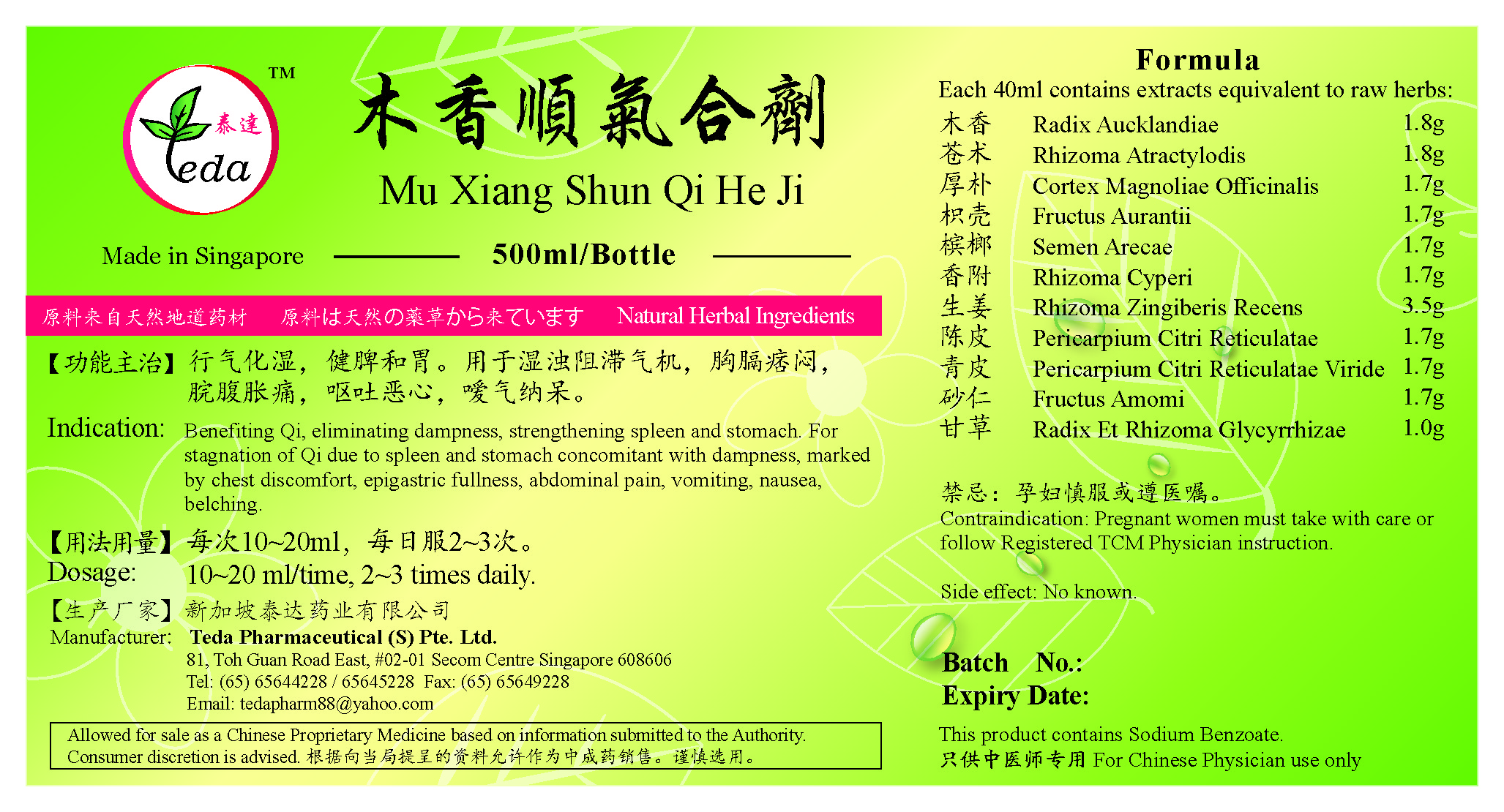 木香顺气合剂 Mu Xiang Shun Qi He Ji(500ml) (TMX01) Category: Liquid Preparations UOM: BOT 500ml 【功能主治】行气化湿,健脾和胃。用于湿浊阻滞气机,胸膈痞闷,脘腹胀痛,呕吐恶心,嗳气纳呆。 Indication: Benefiting Qi, eliminating dampness, strengthening spleen and stomach. For stagnation of Qi due to spleen and stomach concomitant with dampness, marked by chest discomfort, epigastric fullness, abdominal pain, vomiting, nausea, belching. Ingredients: 木香 Radix Aucklandiae 砂仁 Fructus Amomi 香附 Rhizoma Cyperi 槟榔 Semen Arecae 甘草 Radix Et Rhizoma Glycyrrhizae 陈皮 Pericarpium Citri Reticulatae 厚朴 Cortex Magnoliae Officinalis 枳壳 Fructus Aurantii 苍术 Rhizoma Atractylodis 青皮 Pericarpium Citri Reticulatae Viride 生姜 Rhizoma Zingiberis Recens SGD 13.30 |