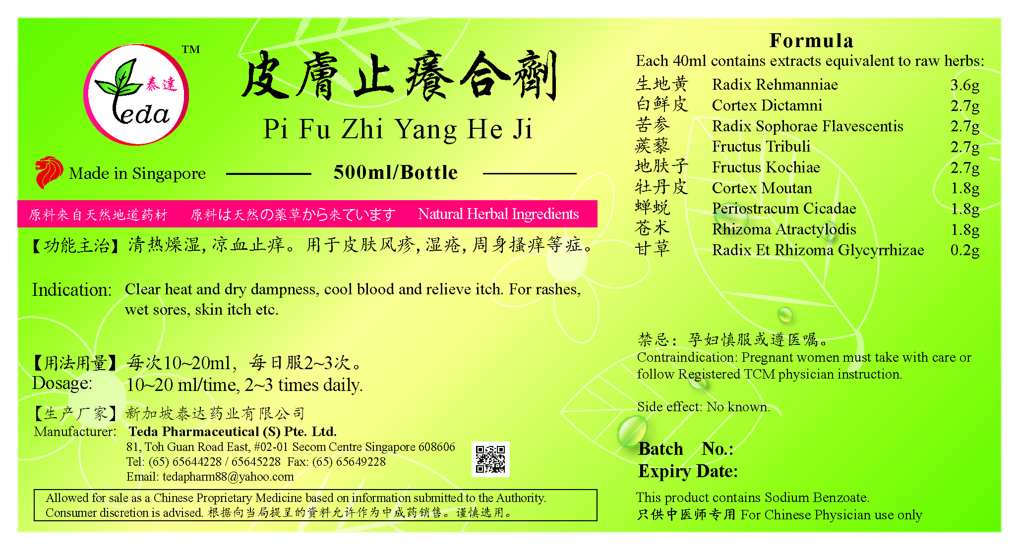 皮肤止痒合剂 Pi Fu Zhi Yang He Ji(500ml) (TPF01) Category: Liquid Preparations UOM: BOT 500ml 【功能主治】清热燥湿,凉血止痒。用于皮肤风疹,湿疮,周身搔痒等症。 Indication: Clear heat and dry dampness, cool blood and relieve itch. For rashes,wet sores, skin itch etc. Ingredients: 苦参 Radix Sophorae Flavescentis 白鲜皮 Cortex Dictamni 牡丹皮 Cortex Moutan 生地黄 Radix Rehmanniae 蒺藜 Fructus Tribuli 地肤子 Fructus Kochiae 蝉蜕 Periostracum Cicadae 苍术 Rhizoma Atractylodis 甘草 Radix Et Rhizoma Glycyrrhizae SGD 12.20 |